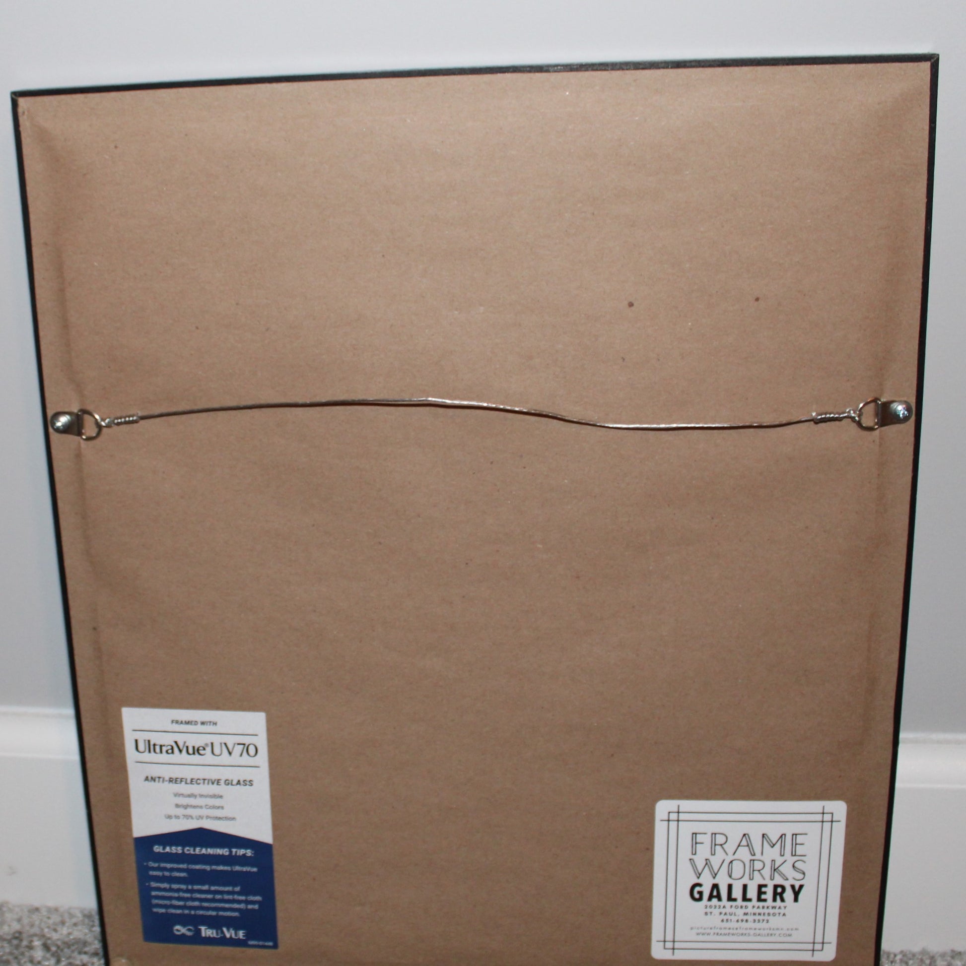 The original hand painted art is surrounded by a custom matte, custom wood frame, and high-quality UV Vue glass. The art, custom frame and matte are brand new.