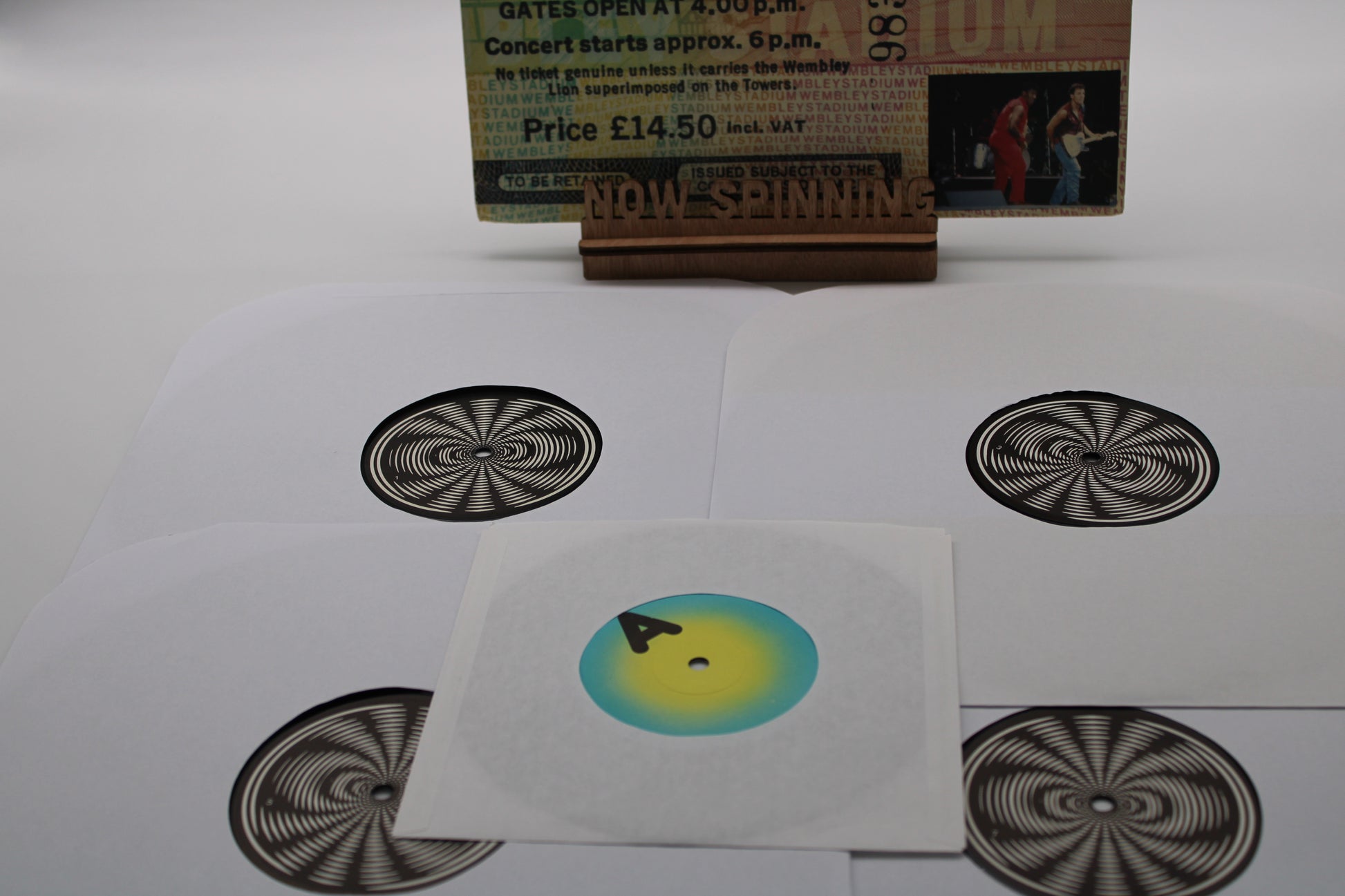 4 LPs Vinyl 12" recorded on July 4, 1985, includes he 7” single in a picture sleeve and recorded on July 6, 1985. All tracks recorded at Wembley Stadium. The entire package: 4 LP 12” Vinyl Records, plus a 7” record in a picture sleeve is near mint! The 12” cover shows minimal shelf wear, no rings or cut-outs. This bootleg is known for excellent sound quality, and was released in Switzerland, 1985. Recorded entirely at Wembley Stadium.