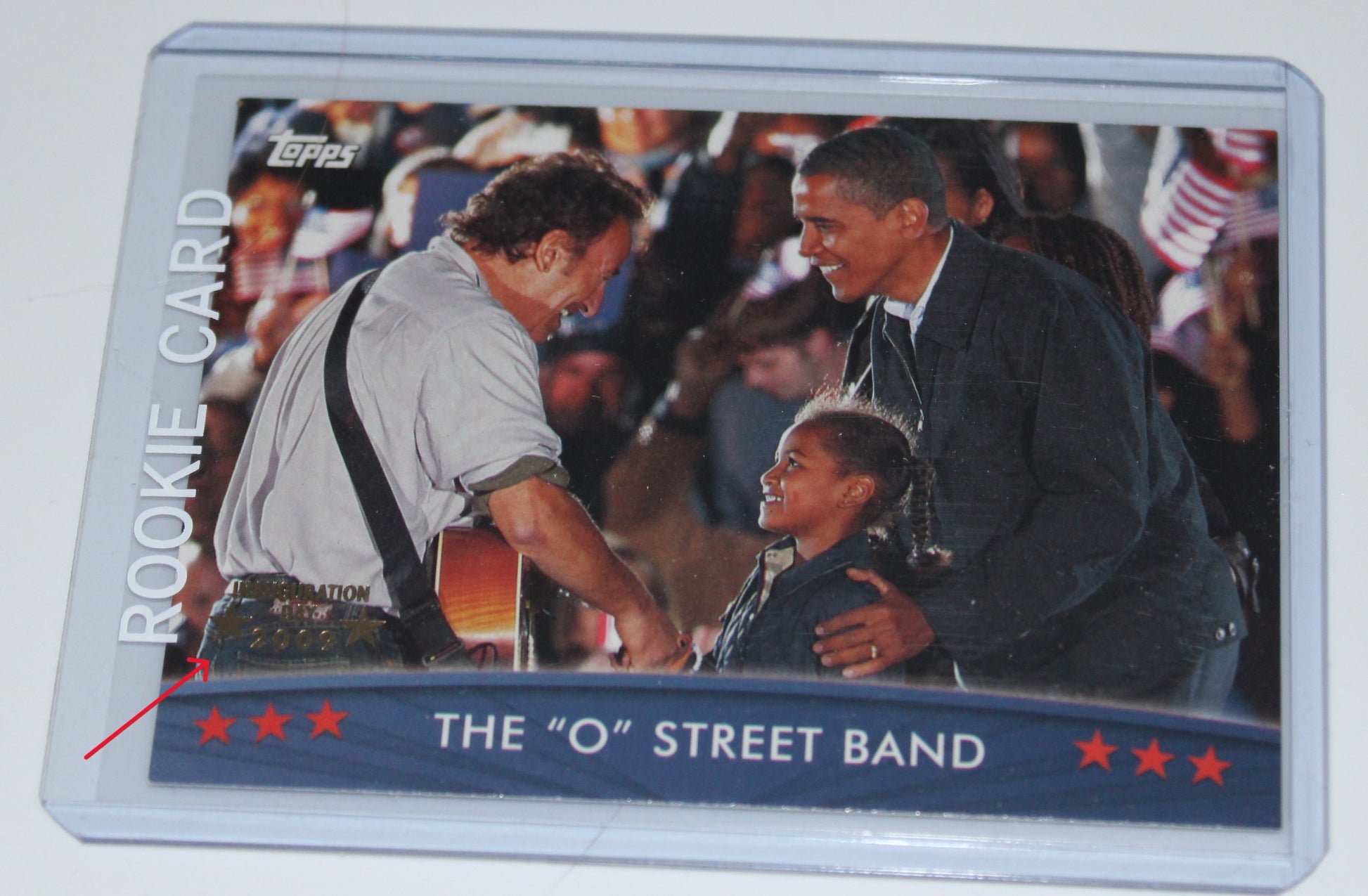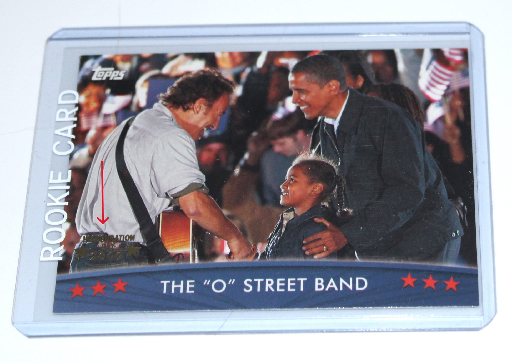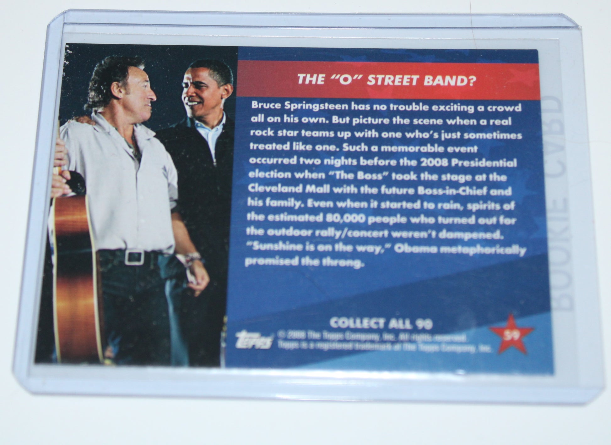 Springsteen Topps 2008 Trading Card is known as Springsteen's "Rookie" Commercial Trading Card. The GOLD FOIL STAMP Inauguration Day 2009 is the most rare Springsteen commercially traded card.