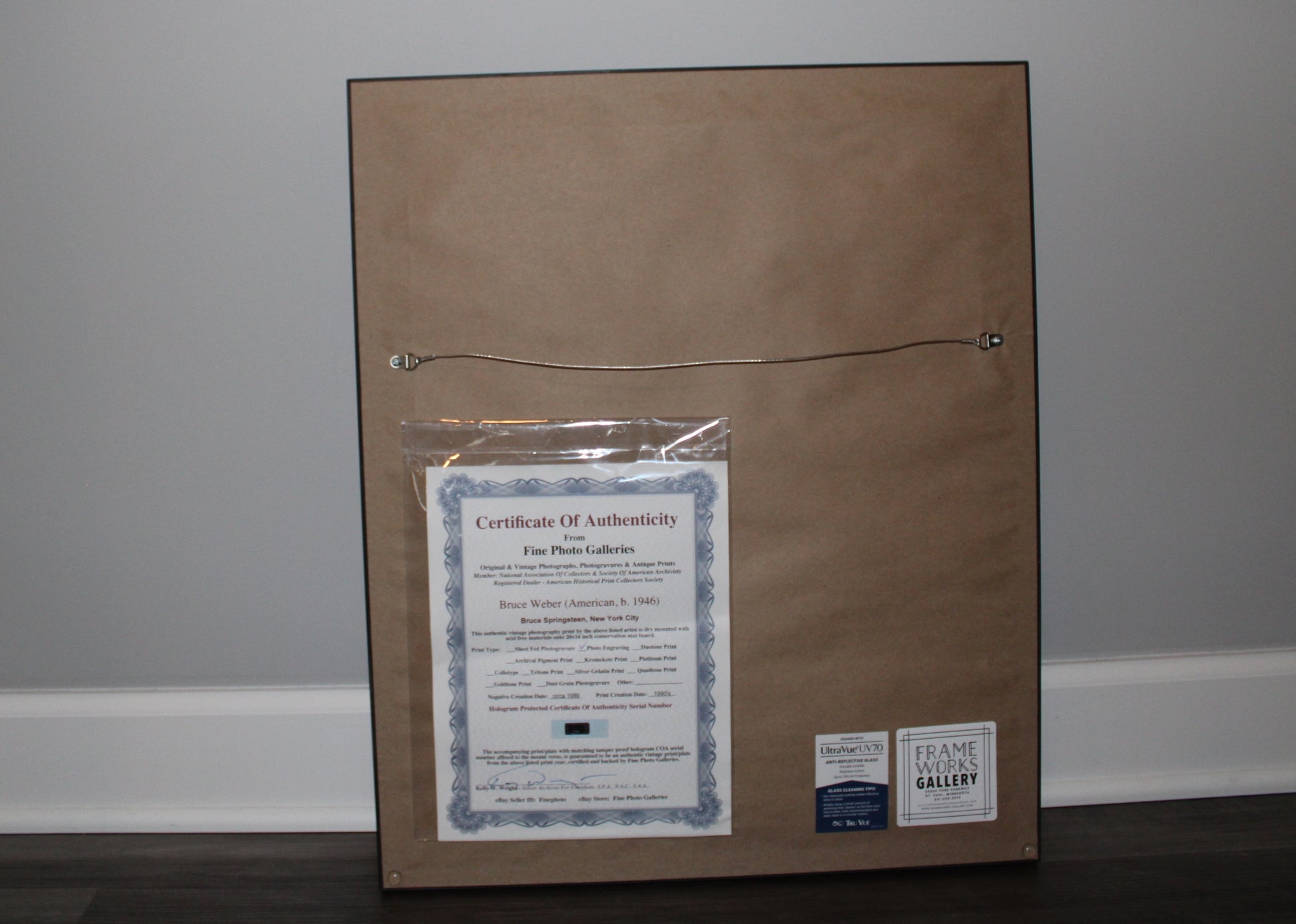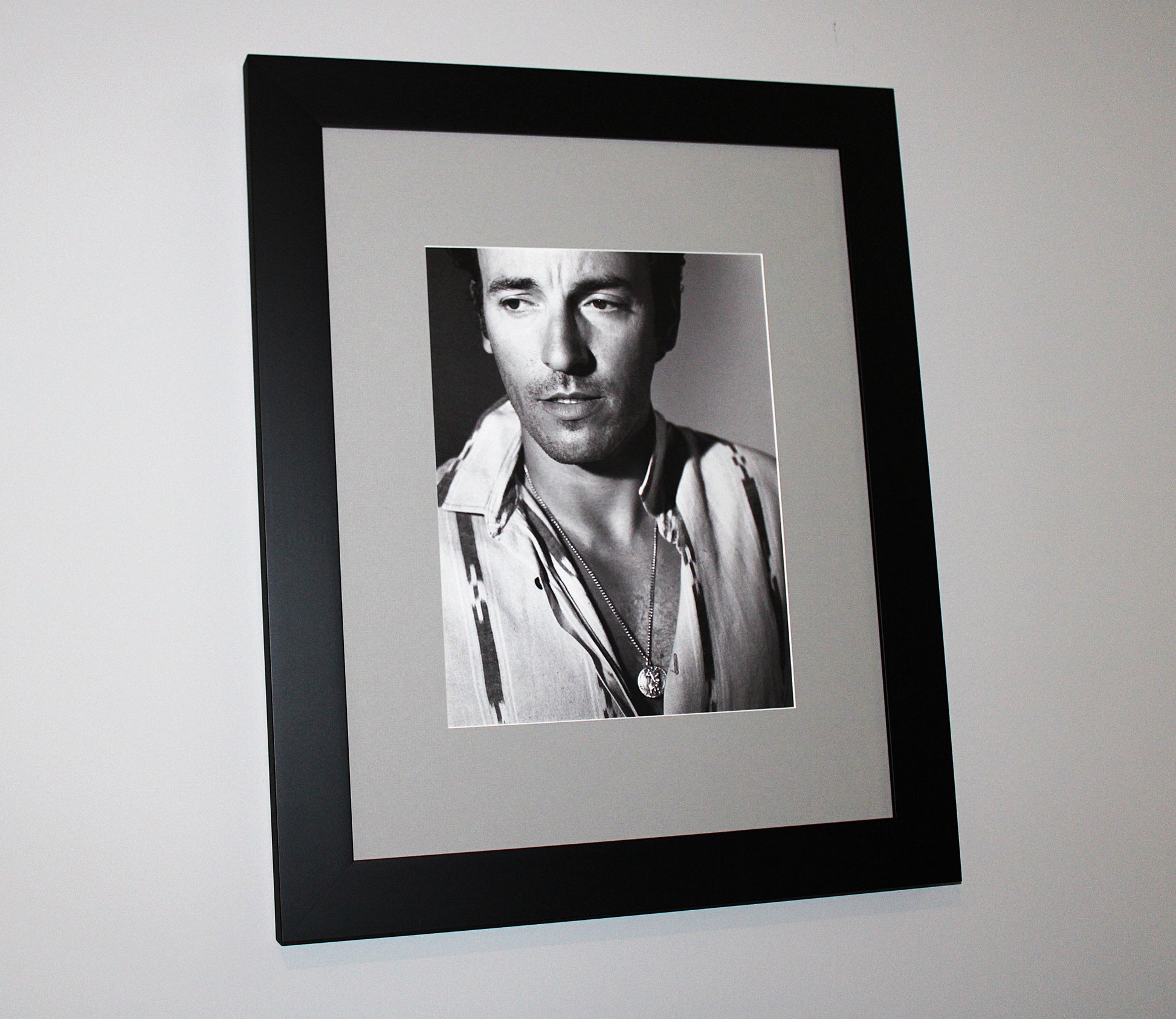 The photographer is Bruce Weber, who captured beautiful photos of Springsteen during the late 1980s. The engraved photo is surrounded by a custom matte, wood frame, and high quality UV Vue glass.