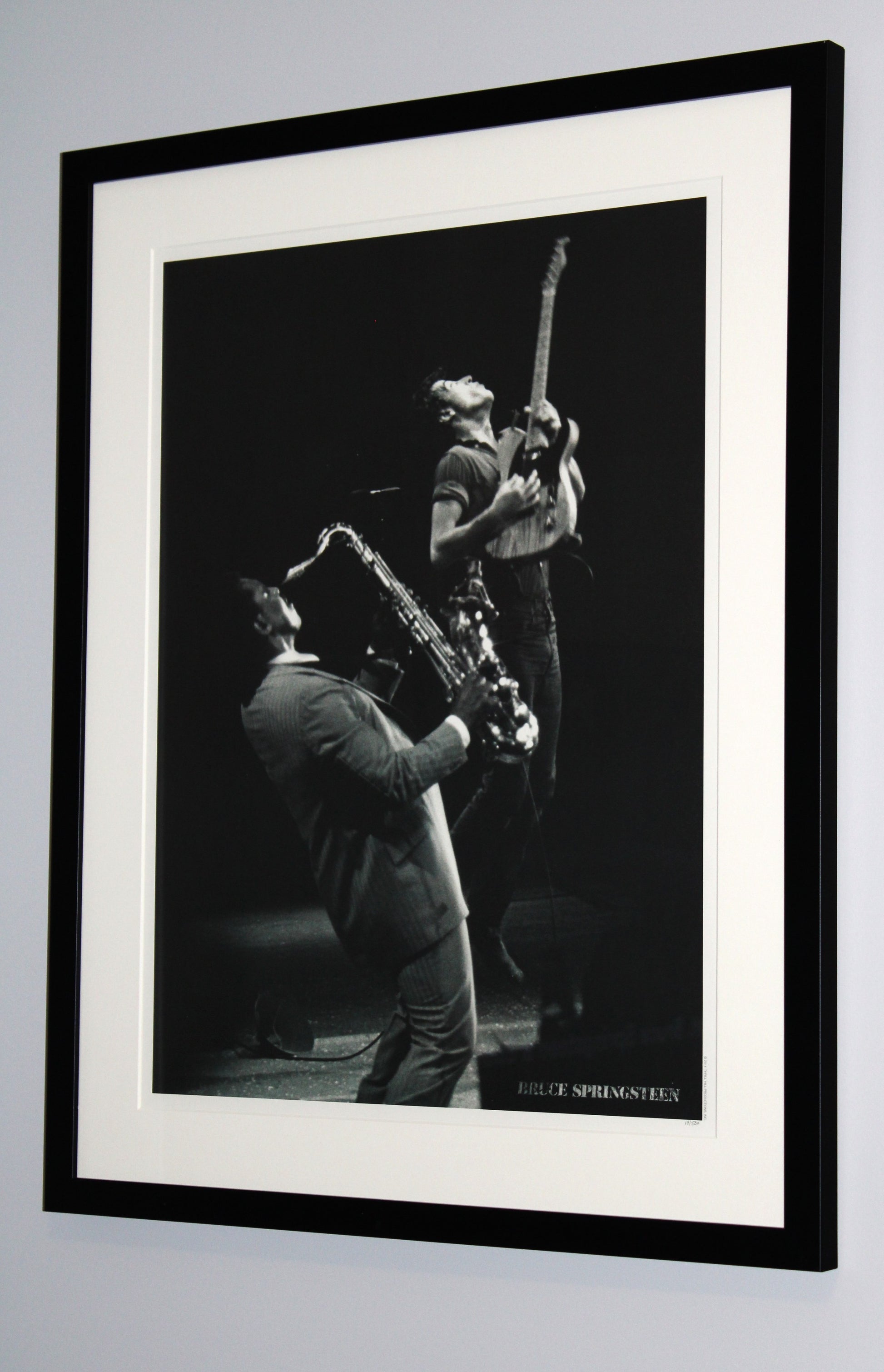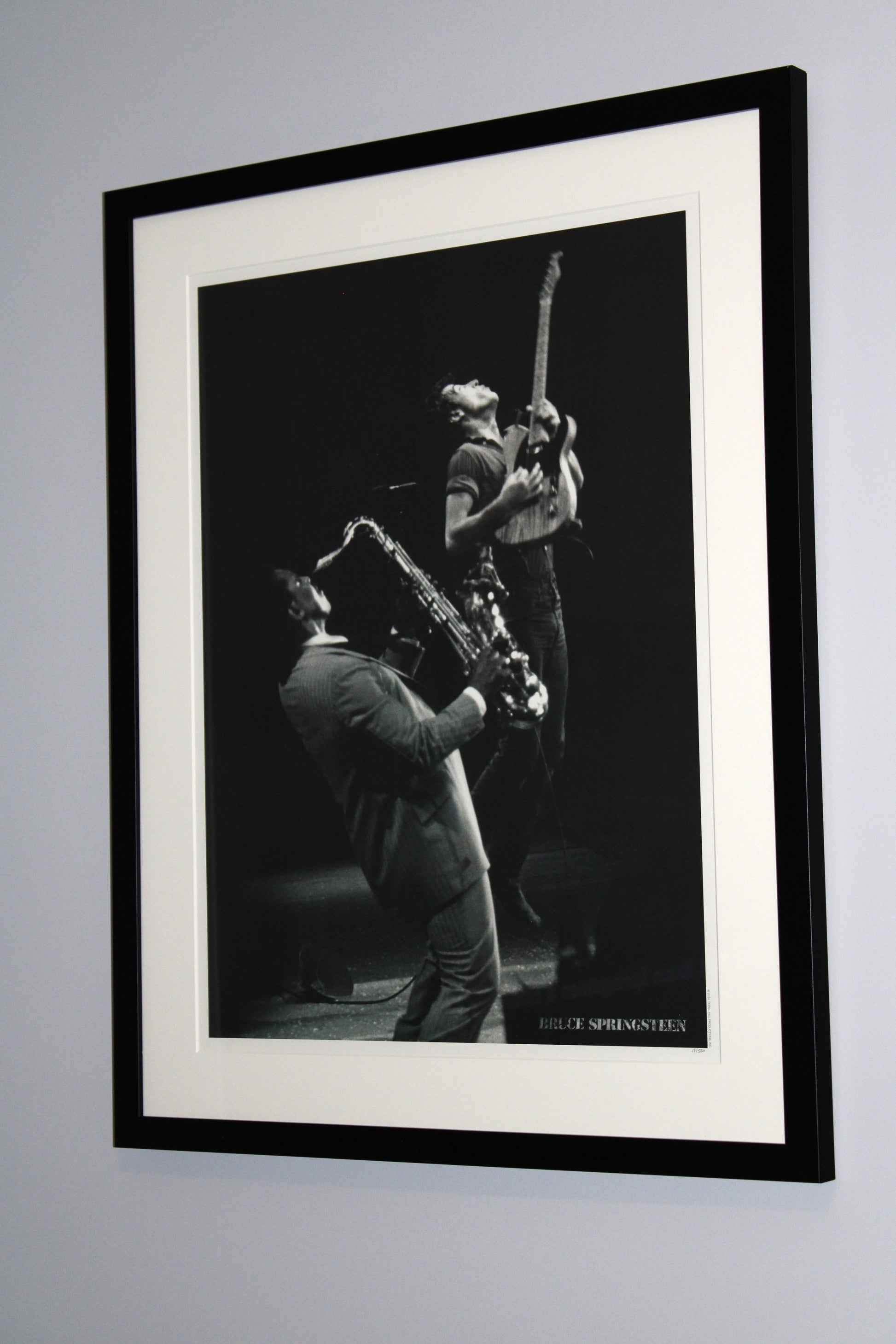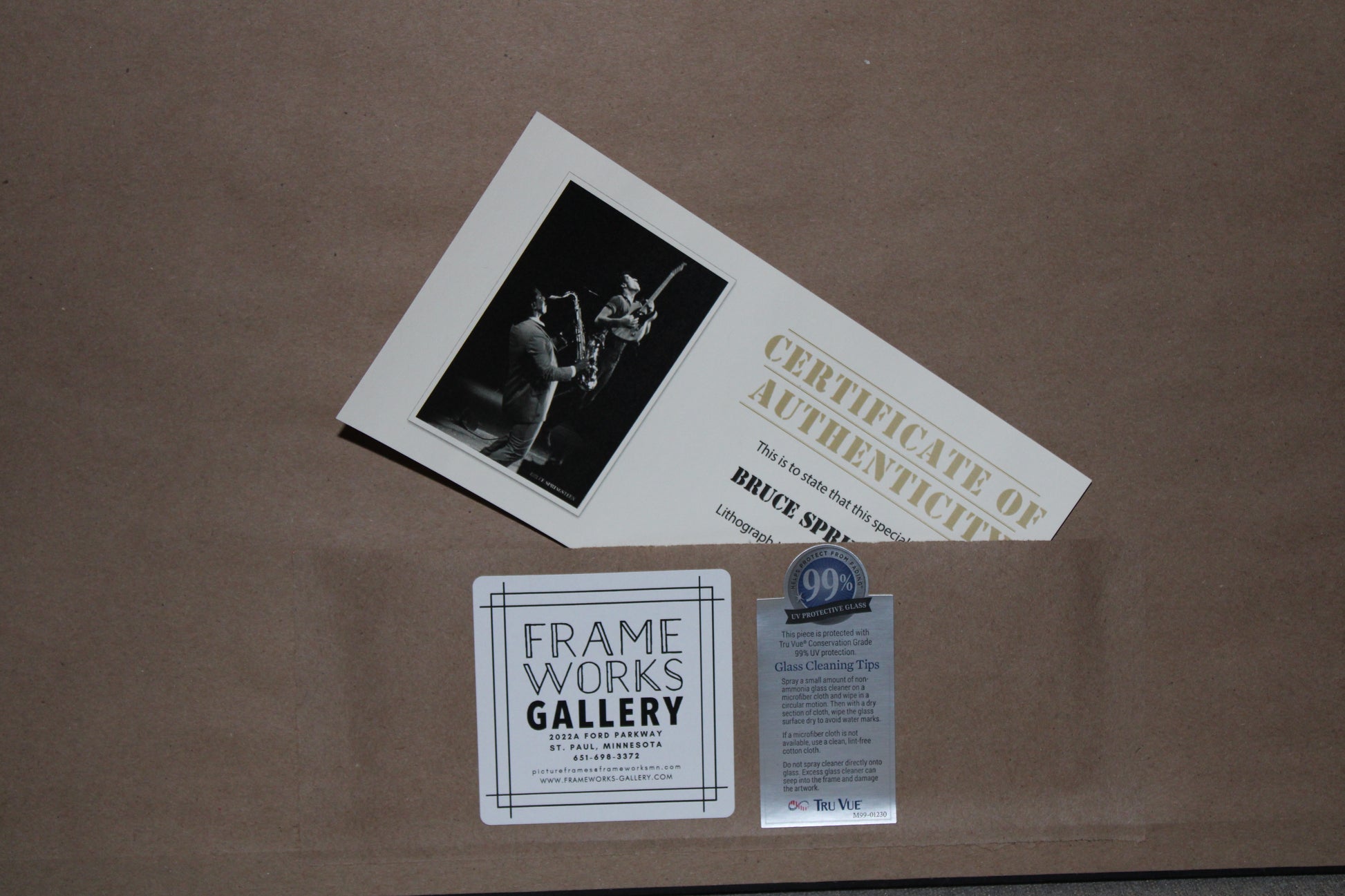 The Thrill Hill Productions original lithograph of Bruce Springsteen and Clarence Clemons is surrounded by a custom matte, wood frame, and high quality glass.