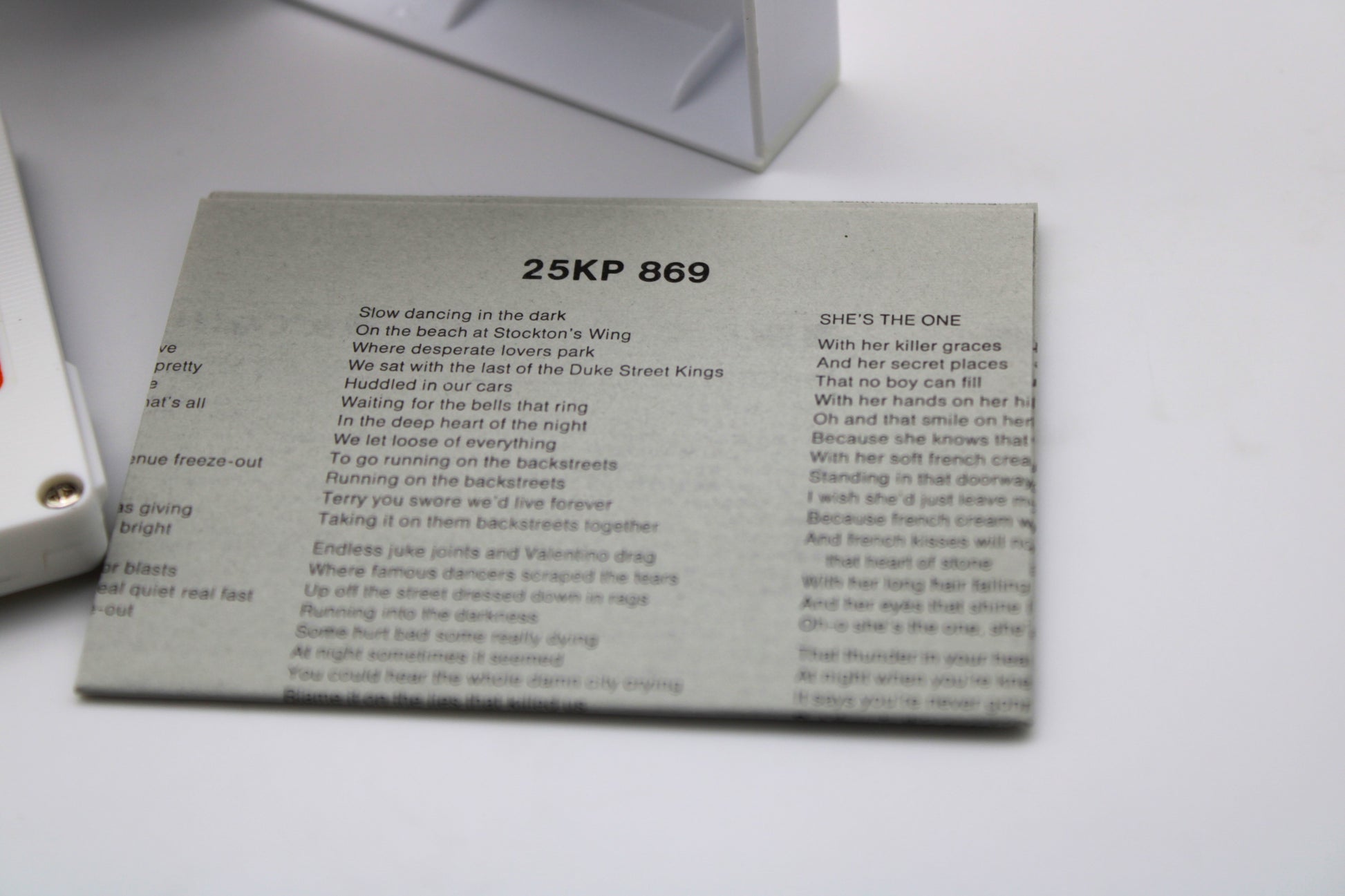 Bruce Springsteen near mint and unplayed Born To Run cassette imported from Japan with all original inserts, lyrics and beautiful unplayed tape quality. See pictures for the actual item in stock and available for a collector. Best one for sale worldwide.